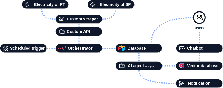 A small Portuguese company needed a solution to scrape fluctuating energy prices in Portugal and Spain, enabling near real-time device usage adjustments based on market opportunities. The data was also accessible to business users through Airtable and a custom chatbot.